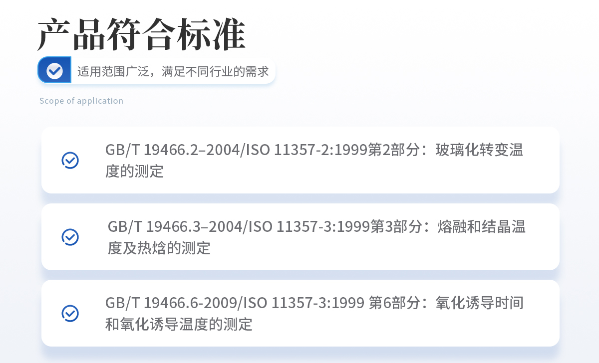 GB/T 19466.2–2004/ISO 11357-2:1999第2部分:玻璃化轉(zhuǎn)變溫度的測定 GB/T 19466.3–2004/ISO 11357-3:1999第3部分:熔融和結(jié)晶溫度及熱焓的測定 GB/T 19466.6-2009/ISO 11357-3:1999 第6部分:氧化誘導時間和氧化誘導溫度的測定