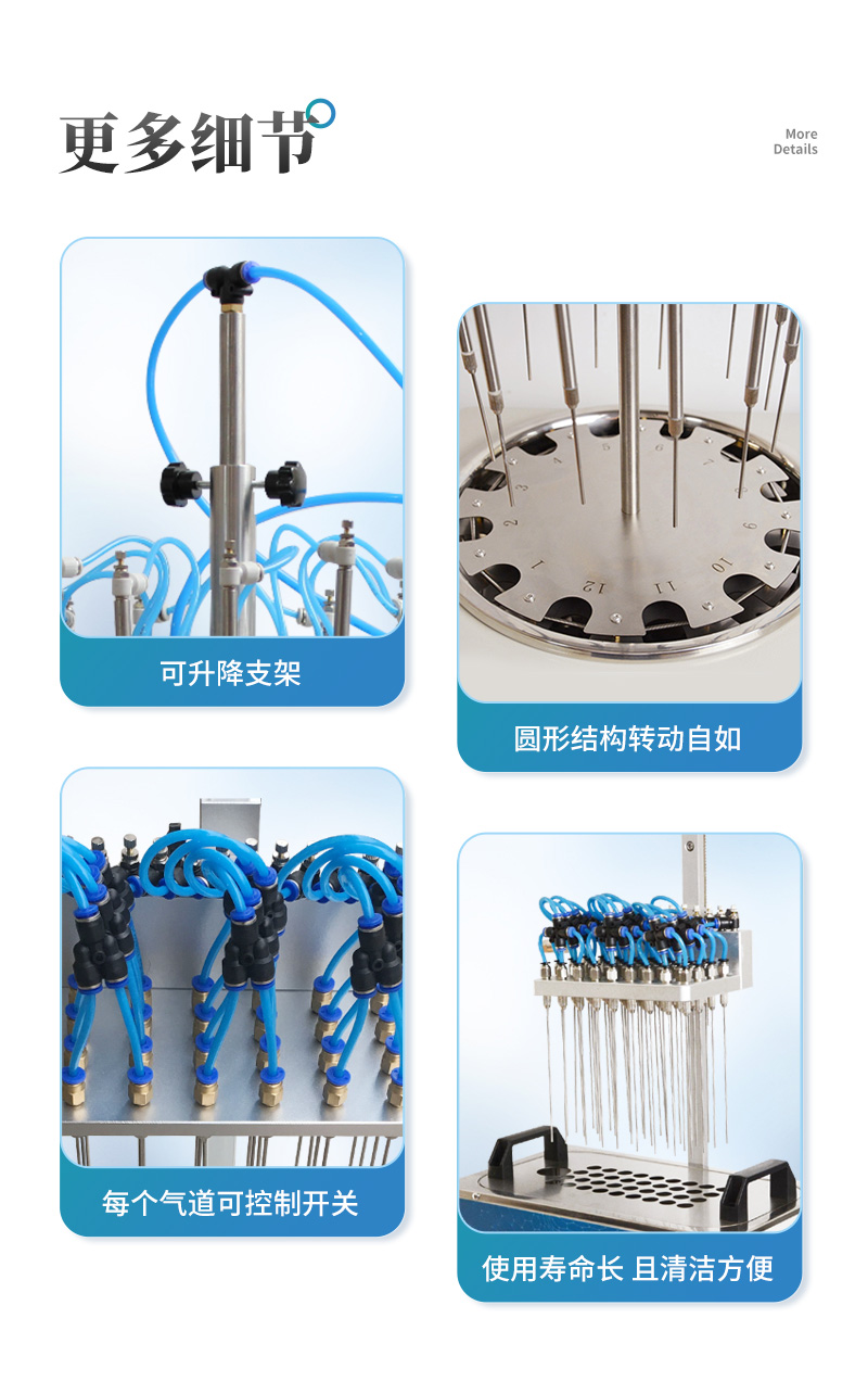 3、氮吹儀有36個(gè)氣道控制開(kāi)關(guān),節(jié)約氣體,每根吹氣針的位置可獨(dú)立改變吹掃位置,使之適用不同的樣品容器及不同的樣品位置