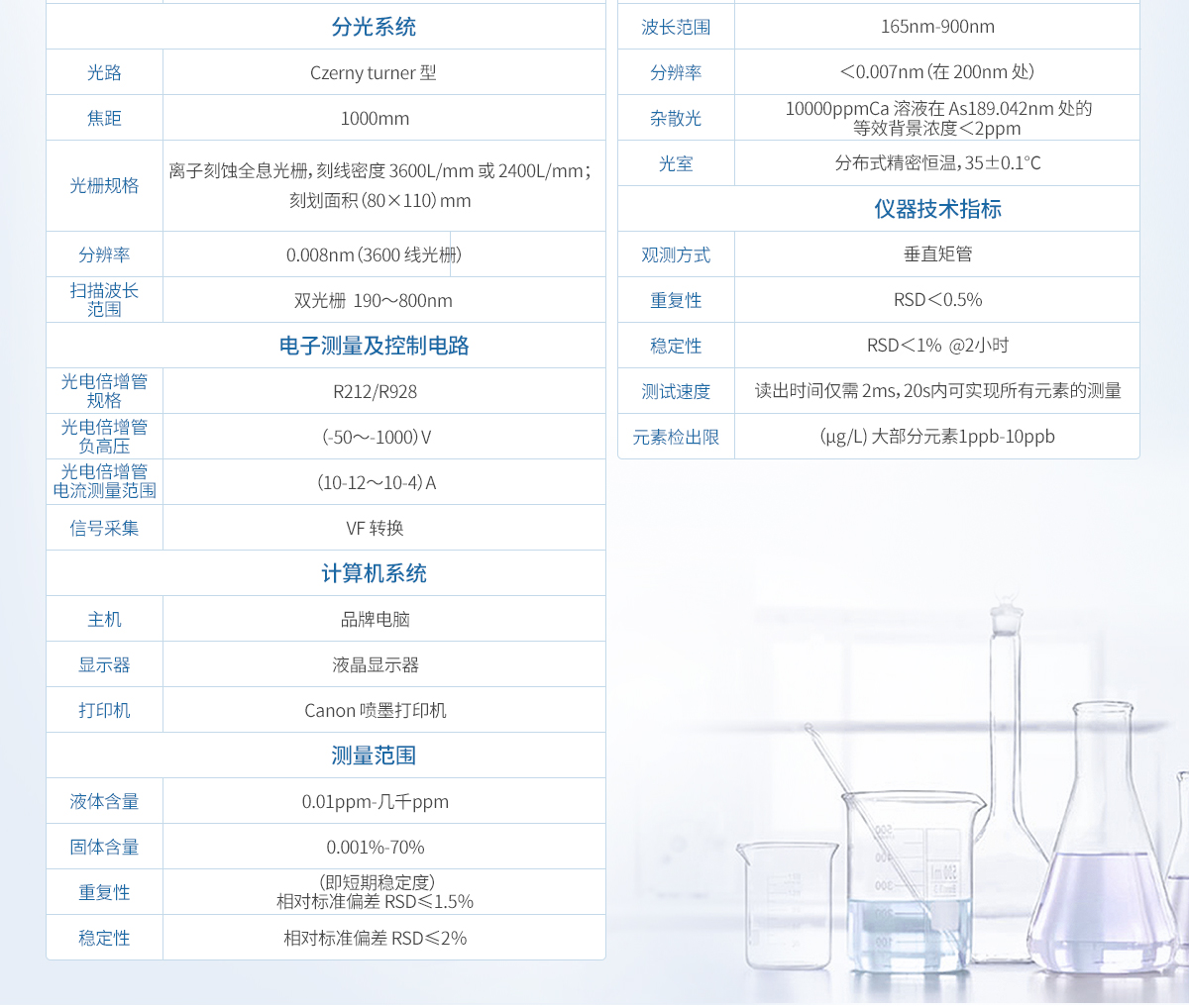 6、性能指標(biāo) 6.1 分析速度:≥每分鐘 50 個元素或譜線,而且每條測量譜線的積分時間≥10 秒; 6.2 樣品消耗量:<2ml,測定不少于 70 個元素; 6.3 譜線靈活性:可實現(xiàn)分析元素的定性、半定量和定量分析; 6.4 線性動態(tài)范圍:≥106; 6.5 內(nèi)標(biāo)校正:內(nèi)標(biāo)校正功能,可實現(xiàn)內(nèi)標(biāo)元素和測量元素的同時曝光; 6.6 精密度:測定 1ppm 或 10ppm 多元素混合標(biāo)準(zhǔn)溶液,重復(fù)測定十次的 RSD≤0.5%; 6.7 穩(wěn)定性:測定 1ppm 或 10ppm 多元素混合標(biāo)準(zhǔn)溶液,長時間穩(wěn)定性 RSD<1.0%; 6.8 檢出限:典型元素檢出限z低可達(dá) 0.1ug/L。
