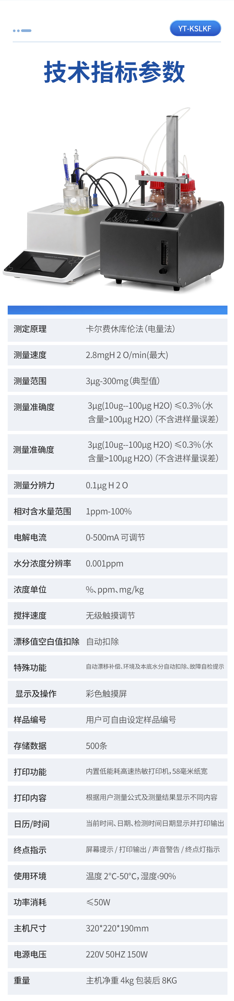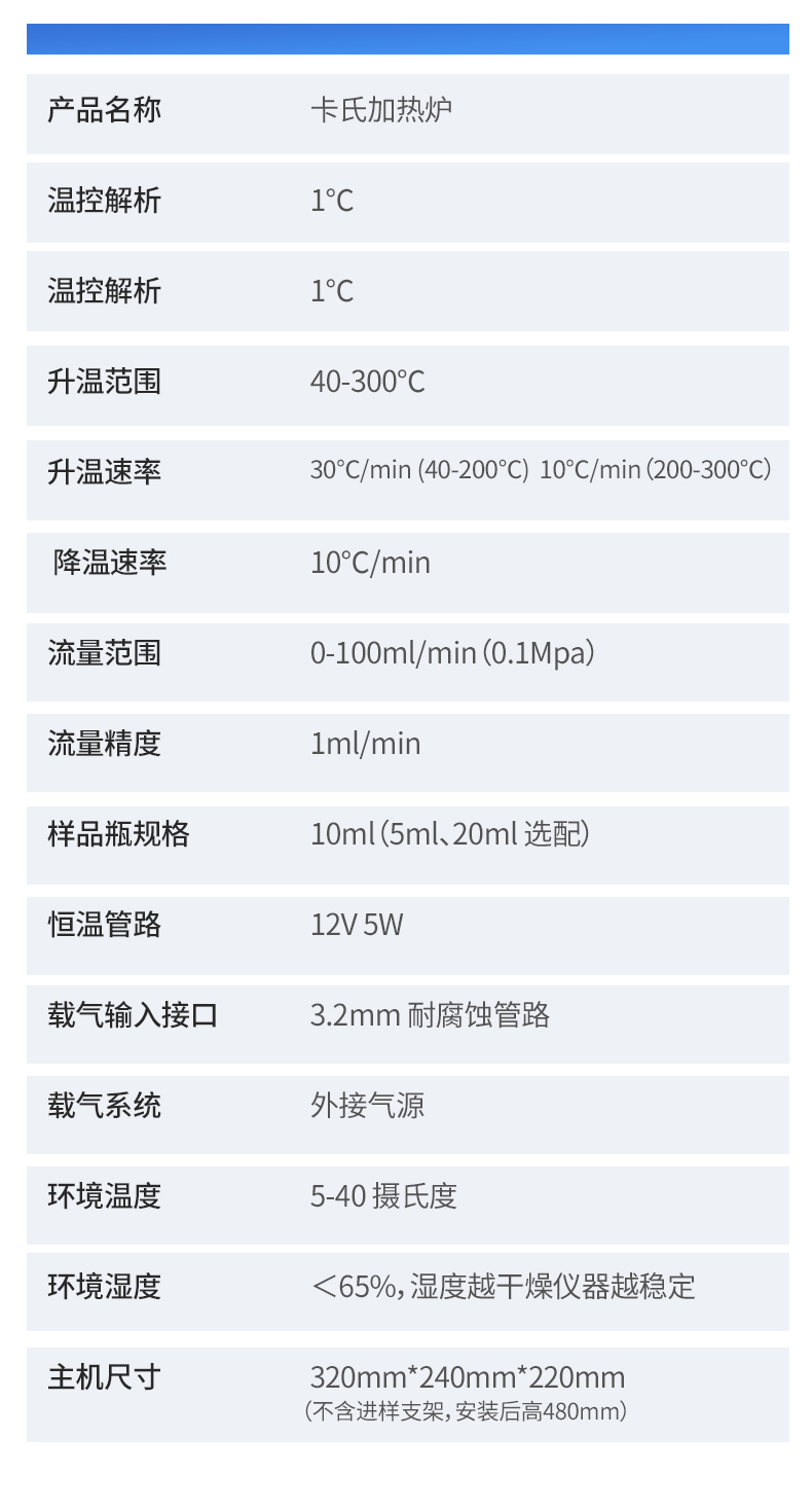 | 1. 測(cè)定原理:卡爾費(fèi)休庫(kù)倫法(電量法) | 2. 測(cè)量速度:2.8mgH 2 O/min(**) | 3. 測(cè)量范圍:3μg-300mg(典型值) | 4. 測(cè)量準(zhǔn)確度:3μg(10ug--100μg H2O) ≤0.3%(水含量>100μg H2O)(不含進(jìn)樣量誤差) | 5. 測(cè)量準(zhǔn)確度:3μg(10ug--100μg H2O) ≤0.3%(水含量>100μg H2O)(不含進(jìn)樣量誤差) | 6. 測(cè)量分辨力:0.1μg H 2 O | 7. 相對(duì)含水量范圍:1ppm-100% | 8. 電解電流:0-500mA 可調(diào)節(jié) | 9. 水分濃度分辨率:0.001ppm | 10. 濃度單位:%、ppm、mg/kg | 11. 攪拌速度:無(wú)級(jí)觸摸調(diào)節(jié) | 12. 漂移值空白值扣除:自動(dòng)扣除 | 13. 特殊功能:自動(dòng)漂移補(bǔ)償、環(huán)境及本底水分自動(dòng)扣除、故障自檢提示 | 14. 顯示及操作:彩色觸摸屏 | 15. 樣品編號(hào):用戶可自由設(shè)定樣品編號(hào) | 16. 存儲(chǔ)數(shù)據(jù):500條 | 17. 打印功能:內(nèi)置低能耗高速熱敏打印機(jī),58毫米紙寬 | 18. 打印內(nèi)容:根據(jù)用戶測(cè)量公式及測(cè)量結(jié)果顯示不同內(nèi)容 | 19. 日歷/時(shí)間:當(dāng)前時(shí)間、日期、檢測(cè)時(shí)間日期顯示并打印輸出 | 20. 終點(diǎn)指示:屏幕提示 / 打印輸出 / 聲音警告 / 終點(diǎn)燈指示 | 21. 使用環(huán)境:溫度 2℃-50℃,濕度?90% | 22. 功率消耗:≤50W | 23. 主機(jī)尺寸:320*220*190mm | 24. 電源電壓:220V 50HZ 150W | 25. 重量:主機(jī)凈重 4kg 包裝后 8KG | 26. 產(chǎn)品名稱:卡氏加熱爐 | 27. 溫控解析:1℃ | 28. 溫控解析:1℃ | 29. 升溫范圍:40-300℃ | 30. 升溫速率:30℃/min (40-200℃) 10℃/min(200-300℃) | 31. 降溫速率:10℃/min | 32. 流量范圍:0-100ml/min(0.1Mpa) | 33. 流量精度:1ml/min | 34. 樣品瓶規(guī)格:10ml(5ml、20ml 選配) | 35. 恒溫管路:12V 5W | 36. 載氣輸入接口:3.2mm 耐腐蝕管路 | 37. 載氣系統(tǒng):外接氣源 | 38. 環(huán)境溫度:5-40 攝氏度 | 39. 環(huán)境濕度:<65%,濕度越干燥儀器越穩(wěn)定 | 40. 主機(jī)尺寸:320mm*240mm*220mm(不含進(jìn)樣支架,安裝后高480mm) |