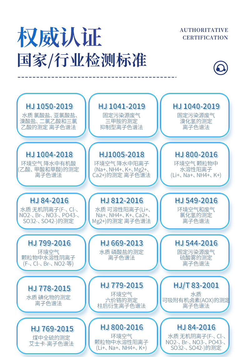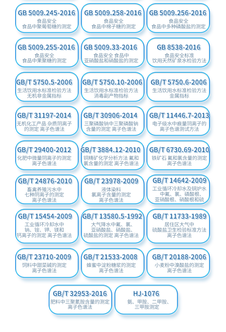 | HJ 1050-2019:水質(zhì) 氯酸鹽、亞氯酸鹽、溴酸鹽、二氯乙酸和三氯乙酸的測定 離子色譜法 | HJ 1041-2019 固定污染源廢氣 三甲胺的測定 抑制型離子色譜法 | HJ 1040-2019 固定污染源廢氣 溴化氫的測定 離子色譜法 | HJ 1004-2018 環(huán)境空氣 降水中有機(jī)酸(乙酸、甲酸和草酸)的測定 離子色譜法 | HJ1005-2018 環(huán)境空氣 降水中陽離子(Na+、NH4+、K+、Mg2+、Ca2+)的測定 離子色譜法 | HJ 800-2016 環(huán)境空氣 顆粒物中水溶性陽離子(Li+、Na+、NH4+、K+) | HJ 84-2016 水質(zhì) 無機(jī)陰離子(F-、Cl-、NO2-、Br-、NO3-、PO43-、SO32-、SO42-)的測定 | HJ 812-2016 水質(zhì) 可溶性陽離子(Li+、Na+、NH4+、K+、Ca2+、Mg2+)的測定 離子色譜法 | HJ 549-2016 環(huán)境空氣和廢氣 氯化氫的測定 離子色譜法 | HJ 799-2016 環(huán)境空氣 顆粒物中水溶性陰離子(F-、Cl-、Br-、NO2-等) | HJ 669-2013 水質(zhì) 磷酸鹽的測定 離子色譜法 | HJ 544-2016 固定污染源廢氣 硫酸霧的測定 離子色譜法 | HJ 778-2015 水質(zhì) 碘化物的測定 離子色譜法 | HJ 779-2015 環(huán)境空氣 六價鉻的測定 柱后衍生離子色譜法 | HJ/T 83-2001 水質(zhì) 可吸附有機(jī)鹵素(AOX)的測定 離子色譜法 | HJ 769-2015 煤中全硫的測定 艾士卡-離子色譜法 | HJ 800-2016 環(huán)境空氣 顆粒物中水溶性陽離子(Li+、Na+、NH4+、K+) | HJ 84-2016 水質(zhì) 無機(jī)陰離子(F-、Cl-、NO2-、Br-、NO3-、PO43-、SO32-、SO42-)的測定 | GB 5009.245-2016 食品安全 食品中聚葡萄糖的測定 | GB 5009.258-2016 食品安全 食品中棉子糖的測定 | GB 5009.256-2016 食品安全 食品中多種磷酸鹽的測定 | GB 5009.255-2016 食品安全 食品中果聚糖的測定 | GB 5009.33-2016 食品安全 食品中亞硝酸鹽和硝酸鹽的測定 | GB 8538-2016 食品安全標(biāo)準(zhǔn) 飲用天然礦泉水檢驗方法 | GB/T 5750.5-2006 生活飲用水標(biāo)準(zhǔn)檢驗方法 無機(jī)非金屬指標(biāo) | GB/T 5750.10-2006 生活飲用水標(biāo)準(zhǔn)檢驗方法 消毒副產(chǎn)物指標(biāo) | GB/T 5750.6-2006 生活飲用水標(biāo)準(zhǔn)檢驗方法 金屬指標(biāo) | GB/T 31197-2014 無機(jī)化工產(chǎn)品 雜質(zhì)陰離子的測定 離子色譜法 | GB/T 30906-2014 三聚磷酸鈉中三聚磷酸鈉含量的測定 離子色譜法 | GB/T 11446.7-2013 電子級水中痕量陰離子的離子色譜測試方法 | GB/T 29400-2012 化肥中微量陰離子的測定 離子色譜法 | GB/T 3884.12-2010 銅精礦化學(xué)分析方法 第12部分:氟和氯含量的測定 離子色譜法 | GB/T 6730.69-2010 鐵礦石 氟和氯含量的測定 離子色譜法 | GB/T 24876-2010 畜禽養(yǎng)殖污水中七種陰離子的測定 離子色譜法 | GB/T 23978-2009 液體染料 氯離子含量的測定 離子色譜法 | GB/T 14642-2009 工業(yè)循環(huán)冷卻水及鍋爐水中氟、氯、磷酸根、亞硝酸根、硝酸根和硫 | GB/T 15454-2009 工業(yè)循環(huán)冷卻水中鈉、銨、鉀、鎂和鈣離子的測定 離子色譜法 | GB/T 23710-2009 飼料中甜菜堿的測定 離子色譜法 | GB/T 21533-2008 蜂蜜中淀粉糖漿的測定 離子色譜法 | GB/T 20188-2006 小麥粉中溴酸鹽的測定 離子色譜法 | GB/T 13580.5-1992 大氣降水中氟、氯、亞硝酸鹽、硝酸鹽、硫酸鹽的測定 離子色譜法 | GB/T 32953-2016 肥料中三聚氰胺含量的測定 離子色譜法 | GB/T 11733-1989 居住區(qū)大氣中硫酸鹽衛(wèi)生檢驗標(biāo)準(zhǔn)方法 離子色譜法 | HJ-1076 氨、甲胺、二甲胺、三甲胺測定 |