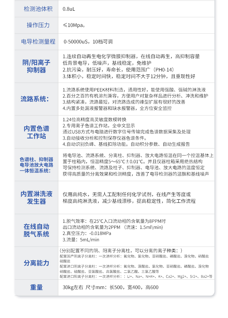 | 1 高壓輸液泵: 微處理器控制的雙柱塞往復(fù)泵,采用**的智能控制算法,能使泵的流量脈動降至**水平。 1.1,材質(zhì):鑲嵌式PEEK材料無阻尼泵頭,PEEK管路,適合于pH為0~14的淋洗液及反相有機(jī)溶劑。 1.2,流量范圍:0.001~9.999ml/min,增量0.001ml/min。 1.3,流量設(shè)定值誤差:≤0.1% 1.4,流量穩(wěn)定性:≤0.1% 1.5,工作壓力:35MPa 1.6,過壓保護(hù):工作壓力超過或低于設(shè)定的上限或下限時,泵將自行關(guān)閉且報警。 | 2 電導(dǎo)檢測器: 2.1,原理:五極電導(dǎo)檢測器 2.2,電極材料:鈍化316L不銹鋼 2.3,基線噪音:≤0.002μS/cm 2.4,基線漂移:≤0.008μS/cm·30min 2.5,zui小檢出濃度:≤0.0005ug/mL(以Cl-計) 2.6,儀器線性:≥0.9995 2.7,定量重復(fù)性:≤0.1%(以Cl-計) 2.8,定性重復(fù)性:≤0.1%(以Cl-計) 2.9,測量范圍:0~50000us/cm 2.10,分辨率:≤0.0020ns/cm 2.11,檢測池體積:0.8uL 2.12,操作壓力:≤10Mpa。 2.13,電導(dǎo)檢測量程: 0-50000uS,10檔可調(diào)。 | 3、 陰、陽離子抑制器: 3.1連續(xù)自動再生電化學(xué)微膜抑制器,在線自動再生,高抑制容量,低背景電導(dǎo),低噪聲,基線穩(wěn)定,免維護(hù)。 3.2抗污染,耐壓好,壽命長,使用范圍廣(PH0-14)。 3.3體積小,穩(wěn)定時間快,穩(wěn)定時間不大于12分鐘,且重現(xiàn)性好。 | 4 流路系統(tǒng): 4.1流路系統(tǒng)使用PEEK材料制造,通用性好,能使用強(qiáng)酸、強(qiáng)堿的淋洗液。 4.2百分之百的有機(jī)溶劑兼容,方便用戶對復(fù)雜樣品進(jìn)行分析、沖洗和維護(hù)。 4.3 結(jié)構(gòu)緊湊,流路*短,對流路造成的峰型擴(kuò)展有很好的改善。 4.4 內(nèi)置多處漏液報警器和缺水報警器,全方位安全監(jiān)控。 | 5 內(nèi)置色譜工作站: 5.1 24位高精度高靈敏度數(shù)模轉(zhuǎn)換。 5.2專用離子色譜工作站,全中文顯示,通過USB方式與電腦進(jìn)行數(shù)字信號傳輸,完成色譜數(shù)據(jù)采集及處理。 5.3自動接收分析和控制保存儀器色譜條件。 5.4自動識別負(fù)峰、基線扣除功能。自動積分參數(shù)、自動生成報告。 | 6 色譜柱、抑制器、電導(dǎo)池、放大電路一體恒溫系統(tǒng): 將電導(dǎo)池、流路系統(tǒng)、分離柱、抑制器、放大電路恒溫在同一個控溫基體上置于柱箱內(nèi),恒溫精度5~65℃±0.01℃。并且儀器柱箱采用絕熱結(jié)構(gòu),可保持檢測系統(tǒng)、流路及柱子、抑制器、電導(dǎo)池、放大電路的溫度恒定,獲得高質(zhì)量的分離效果和檢測精度,改善了電導(dǎo)檢測器的溫飄和基線噪聲。 | 7內(nèi)置淋洗液發(fā)生器,僅用高純水,無需人工配制任何化學(xué)試劑,在線產(chǎn)生等度或梯度高純淋洗液,減少基線漂移,提高穩(wěn)定性,簡化工作流程。 | 8 在線自動脫氣系統(tǒng): 1,脫氣效率:在25℃入口流動相的含氧量為8PPM時,出口流動相的含氧量為2PPM (流速:1.5ml\min) 2,真空壓力:-0.018MPa 3,流量:5mL/min | 9 分離能力:(分別配置不同的陰、陽離子分離柱,可以分離的離子種類:) 配置國產(chǎn)陰離子分離柱:一次進(jìn)樣分析:氟化物、氯化物、亞硝酸鹽、磷酸鹽、溴化物、硝酸鹽、硫酸鹽 配置進(jìn)口陰離子分離柱:一次進(jìn)樣分析:氟化物、溴酸鹽、氯化物、亞硝酸鹽、磷酸鹽、溴化物、硝酸鹽、硫酸鹽、亞氯酸鹽、高氯酸鹽、二氯乙酸、三氯乙酸等 配置進(jìn)口陽離子分離柱:一次進(jìn)樣分析::Li+、Na+、NH4+、K+、Ca2+、Mg2+、Sr2+、Ba2+等 | 10 重量:30kg左右 尺寸mm:長500,寬400,高600 |