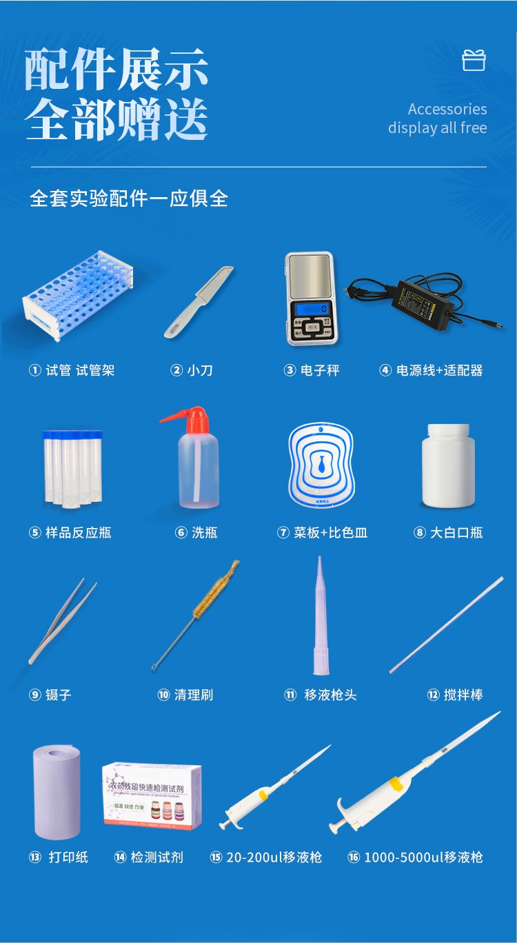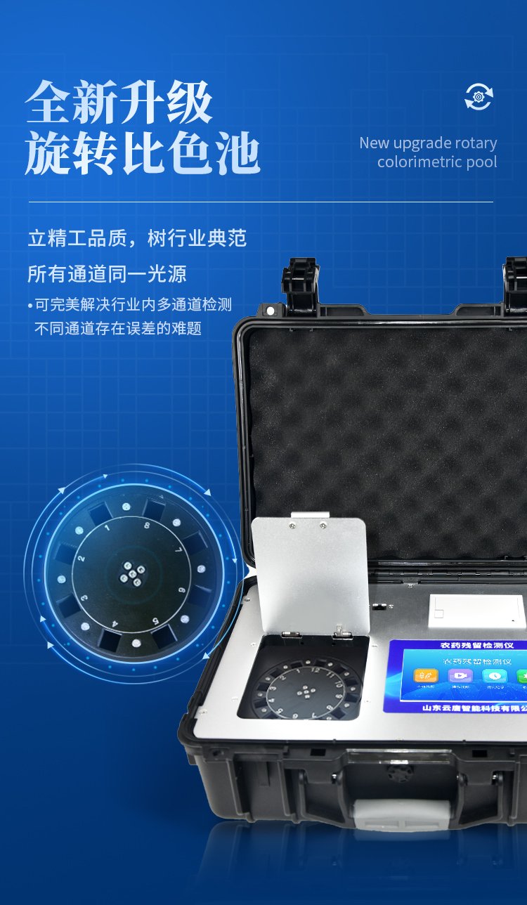 | 機(jī)器采用全新安卓智能系統(tǒng),主控芯片采用 ARM Cortex-A7,RK3288/4核處理器,主頻1.88Ghz,運(yùn)轉(zhuǎn)速度更快速,穩(wěn)定性更強(qiáng)。 | 創(chuàng)新檢測模式: *儀器采用精密旋轉(zhuǎn)比色池設(shè)計(jì),使用光源一致,可以解決各通道間由于光源誤差帶來的檢測結(jié)果誤差問題,檢測結(jié)果更加精準(zhǔn)。 *儀器具有自動(dòng)識別比色皿檢測功能,即:將樣品比色皿放入儀器后,點(diǎn)擊樣品檢測,儀器自動(dòng)識別比色皿進(jìn)行通道檢測。 | 供電方式:交直流兩用,直流 12V 供電,可連接車載電源,可配 6ah 大容量充電鋰電池,方便戶外流動(dòng)測試。 | 顯示方式:7英寸液晶觸摸屏顯示,人性化中文操作界面,讀數(shù)直觀、簡單。 | 檢測通道:8個(gè)檢測通道,可以同時(shí)測試多個(gè)樣品,循環(huán)檢測,即放即檢,每個(gè)樣品由程序控制分別獨(dú)立工作,不會互相干擾。 | 高精光源系統(tǒng): ①①儀器光源采用進(jìn)口超高亮發(fā)光二極管,光源亮度可以自動(dòng)調(diào)節(jié)與校準(zhǔn) ②智能恒流穩(wěn)壓,光強(qiáng)自動(dòng)校準(zhǔn),長時(shí)間連續(xù)工作光源無溫漂現(xiàn)象。 | 智能操作分析系統(tǒng): ①儀器具有100多種蔬菜名稱菜單庫,分類管理,并可按需添加或刪除、編輯蔬菜名稱;可在同一檢測界面自動(dòng)對應(yīng)相關(guān)檢測通道一次性選擇1-24個(gè)樣品名稱,無需退出界面,節(jié)省操作時(shí)間。 ②內(nèi)置新國家限量標(biāo)準(zhǔn),與所測結(jié)果進(jìn)行現(xiàn)場比對,并持續(xù)更新標(biāo)準(zhǔn)。 | 完善的配套硬件: ①采用串口5v打印機(jī),可選擇手動(dòng)打印或者自動(dòng)打印,三分鐘出打印結(jié)果,打印格式為檢測人姓名、吸光度差值、檢測時(shí)間、檢測機(jī)構(gòu)、樣品名稱及結(jié)果判定。 ②儀器具有無線上傳模塊,檢測結(jié)果可批量打印,批量上傳。 | 數(shù)據(jù)調(diào)用: ①儀器可存儲20萬條檢測結(jié)果, ②檢測結(jié)果為Excel表格,方便后期進(jìn)行數(shù)據(jù)分析與匯總報(bào)告 ③儀器采用USB2.0接口設(shè)計(jì),支持 U 盤存儲,方便數(shù)據(jù)的存貯和移動(dòng),并可隨時(shí)與計(jì)算機(jī)直接相連,實(shí)現(xiàn)數(shù)據(jù)查詢、瀏覽、分析、統(tǒng)計(jì)、打印等。 | 后期產(chǎn)品固件可升級。 | 安全證書,放心保障:儀器具有中國計(jì)量科學(xué)研究院校準(zhǔn)證書,權(quán)威認(rèn)證,使用放心。 |
