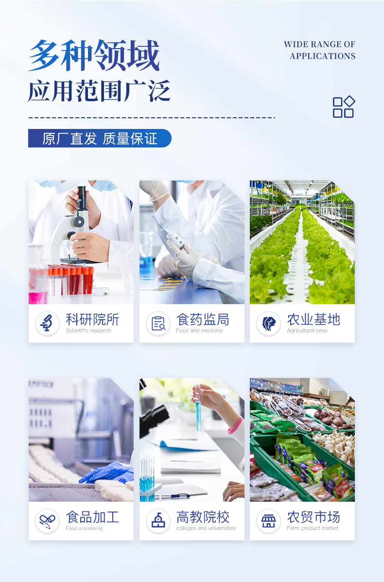 廣泛應(yīng)用于主要用于蔬菜、水果、茶葉、糧食、農(nóng)副產(chǎn)品等食品中有機(jī)磷和氨基甲酸酯類農(nóng)藥殘留的快速檢測;此外還可用于果蔬茶生產(chǎn)基地和農(nóng)貿(mào)批發(fā)銷售市場現(xiàn)場檢測,餐館、學(xué)校、食堂、家庭果蔬加工前的安全速測等。