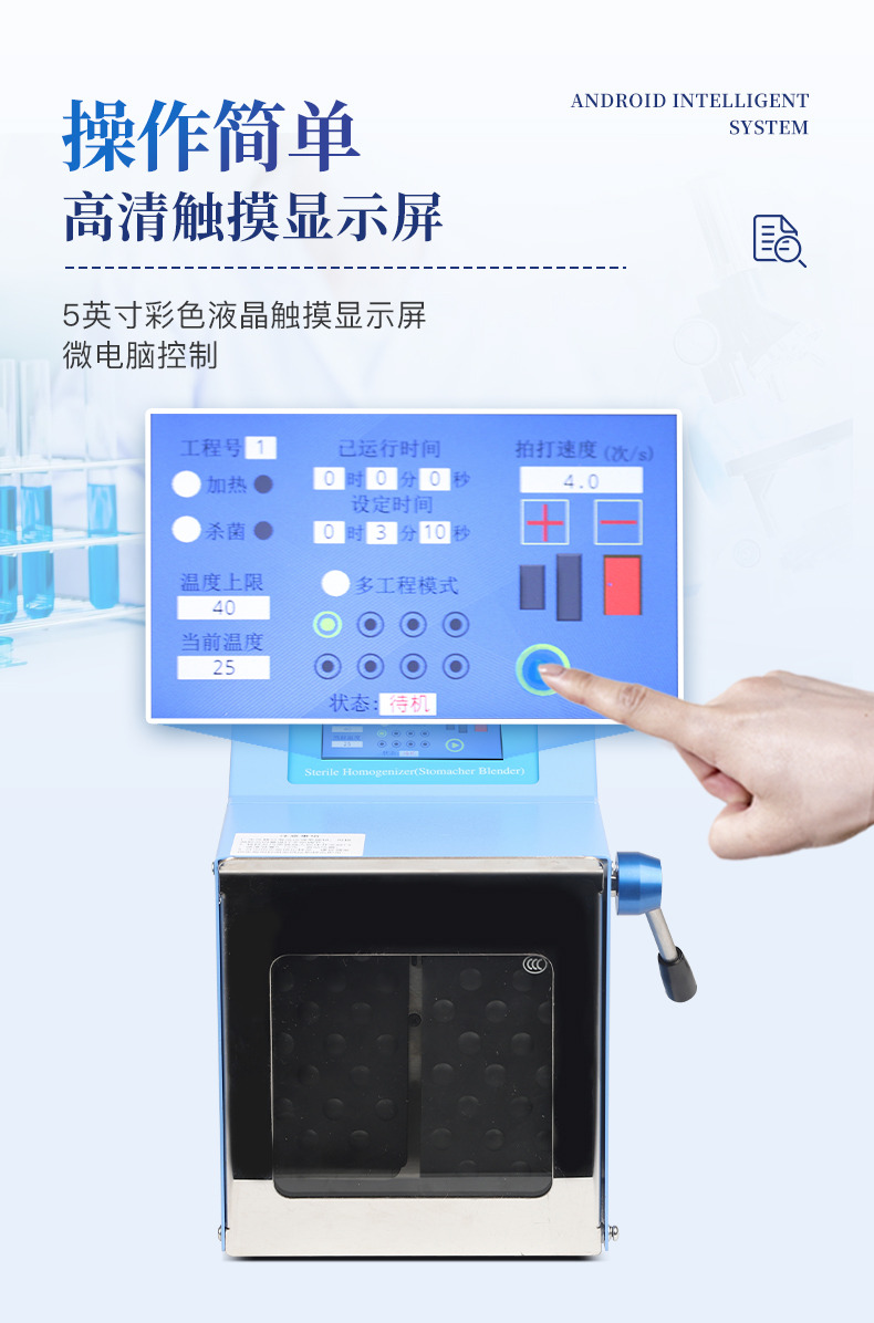 無菌均質(zhì)器使從固體樣品中提取細(xì)菌的過程變得非常簡單,只需將樣品和稀釋液加入到無菌的樣品袋中,然后將樣品袋放入拍擊式均質(zhì)器中即可完成樣品的處理。有效地分離被包含在固體樣品內(nèi)部和表面的微生物均一樣品,確保無菌袋中混合全部的樣品。處理后的樣品溶液可以直接進(jìn)行取樣和分析,沒有樣品的變化和交叉污染的危險。
