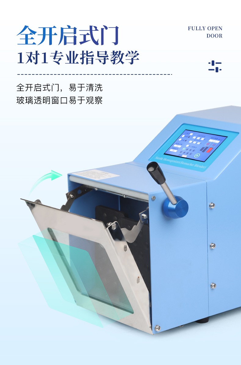 ●5英寸液晶顯示屏。 ●可儲存三組工作程序。 ●可調(diào)整的均質(zhì)時間。 ●均質(zhì)速度可調(diào)節(jié)或固定。 ●拍擊器可調(diào)整前后距離。 ●無菌一次性濾袋,保證衛(wèi)生。 ●全開啟式門,易于清洗。 ●玻璃透明窗口易于觀察 。 ●樣品與均質(zhì)儀無接觸,如無樣品泄露則不需進行系統(tǒng)清洗. ●均質(zhì)柔和、樣品零污染、無損傷、不升溫、不需要滅菌處理,不需洗刷器皿。