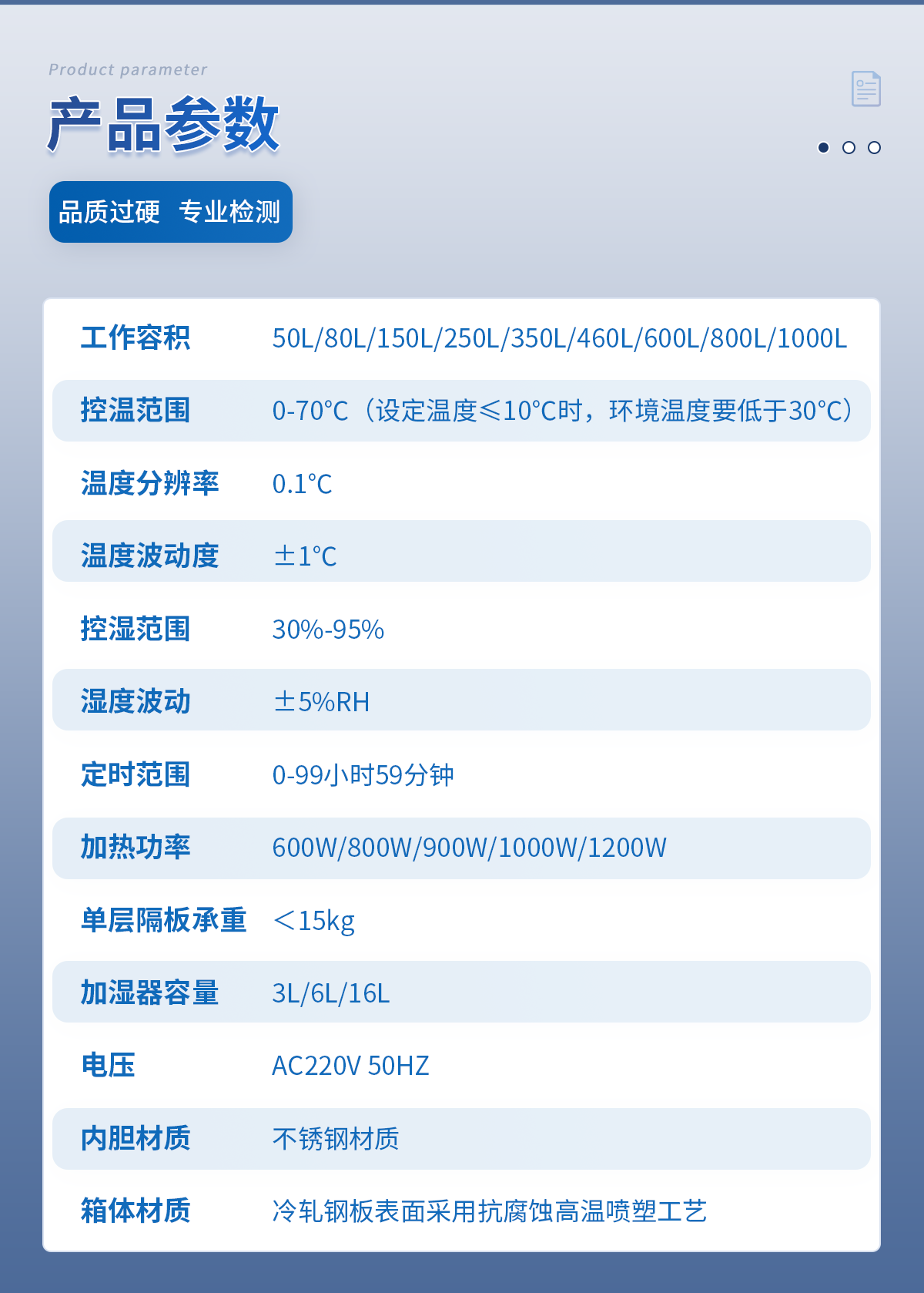 | 工作容積:460L | 箱內(nèi)照明:日光燈 | 控溫范圍:0-70℃(設(shè)定溫度≤10℃時(shí)環(huán)境溫度要低于30℃) | 程序控制:24段 | 溫度分辨率:0.1℃ | 溫度波動(dòng)度:±0.5℃ | 控濕范圍:30%-95% | 定時(shí)范圍:0-99小時(shí)59分鐘 | 加熱功率:1000W | 內(nèi)箱尺寸 寬*深*高(cm):65*64*110 | 外箱尺寸 寬*深*高(cm):79*87*169 | 隔板層數(shù)(標(biāo)配):2層 | 加濕器容量(標(biāo)配):6L | 單層隔板承重:<17kg | 底部總承重:37kg | 層間隔/mm:44 | 卡槽層數(shù):13 | 電壓:AC220V 50HZ | 整機(jī)重量:130kg | 內(nèi)膽材質(zhì):不銹鋼材質(zhì) | 箱體材質(zhì):冷軋鋼板表面采用抗腐蝕高溫噴塑工藝 |