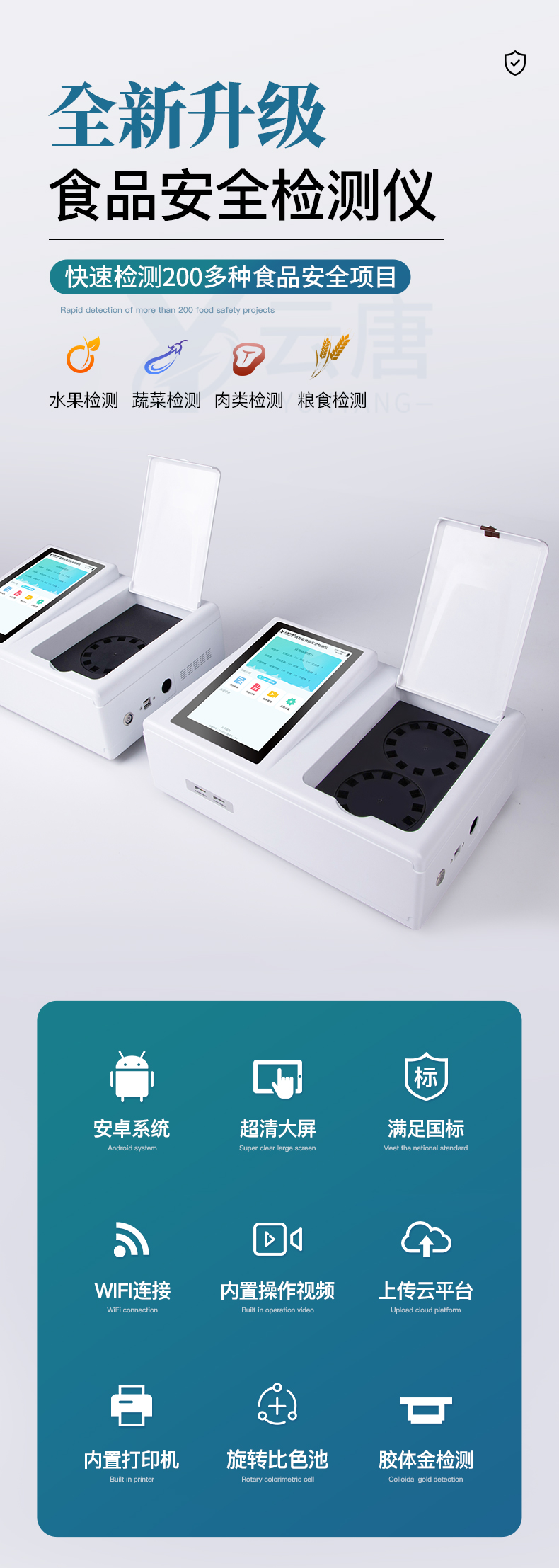 1、儀器采用臺式一體化系統(tǒng)檢測技術,將分光光度模塊、膠體金檢測模塊、新型農(nóng)殘檢測模塊、數(shù)字化管理模塊、無線通訊模塊高度集成于一體,支持檢測200種食品安全檢測項目,同時預留升級檢測方法。