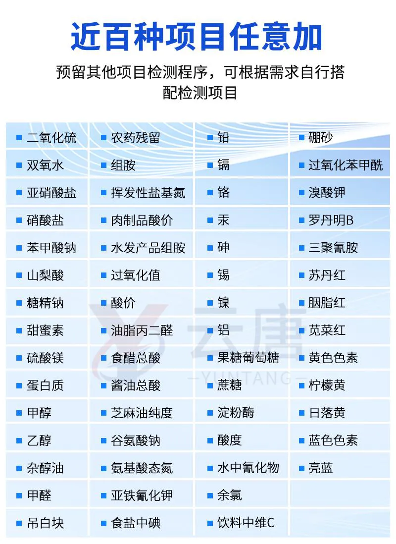 可快速檢測(cè)各類食品中的甲醛、二氧化硫、亞硝酸鹽的含量,儀器預(yù)留其他項(xiàng)目檢測(cè)程序和端口,根據(jù)日后需求可方便的自主增加檢測(cè)項(xiàng)目。