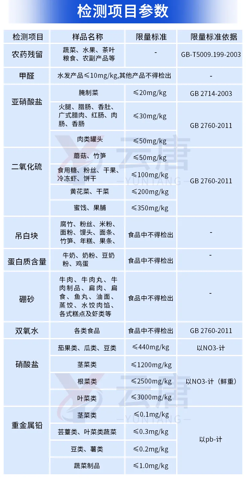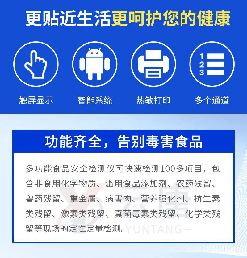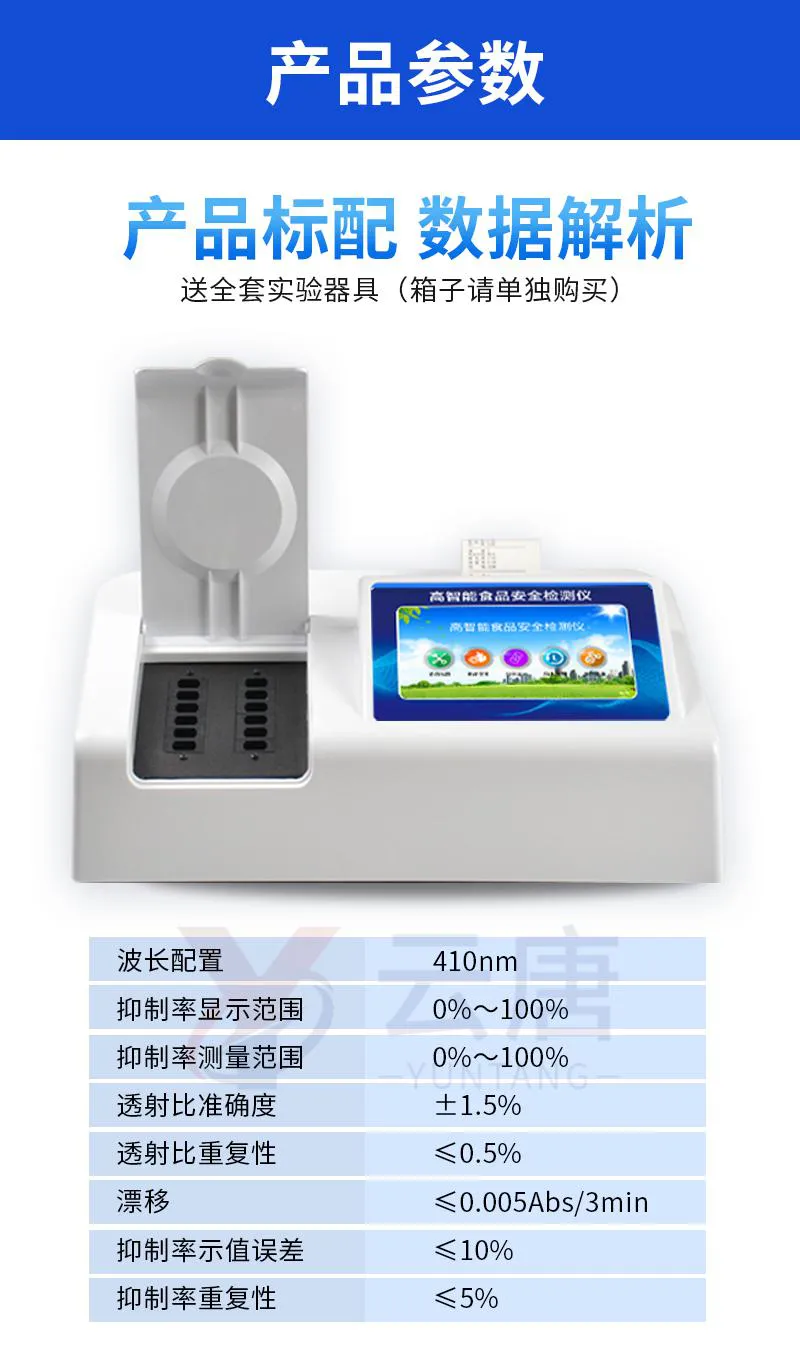 可快速檢測(cè)各類(lèi)食品中的甲醛、吊白塊、二氧化硫、亞硝酸鹽、雙氧水、硼砂、農(nóng)藥殘留、乳及乳制品中蛋白質(zhì)的含量,儀器預(yù)留其他項(xiàng)目檢測(cè)程序和端口,根據(jù)日后需求可方便的自主增加檢測(cè)項(xiàng)目。