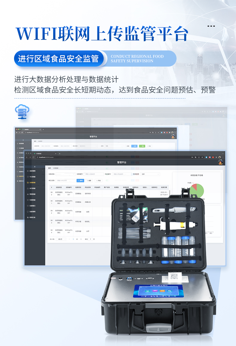 4、儀器帶有監(jiān)管平臺,數(shù)據(jù)可局域網(wǎng)和互聯(lián)網(wǎng)數(shù)據(jù)上傳,檢測結(jié)果直接傳至食品安全監(jiān)管平臺。進(jìn)行區(qū)域食品安全監(jiān)管及大數(shù)據(jù)分析處理與數(shù)據(jù)統(tǒng)計,檢測區(qū)域食品安全長短期動態(tài),達(dá)到食品安全問題預(yù)估、預(yù)警