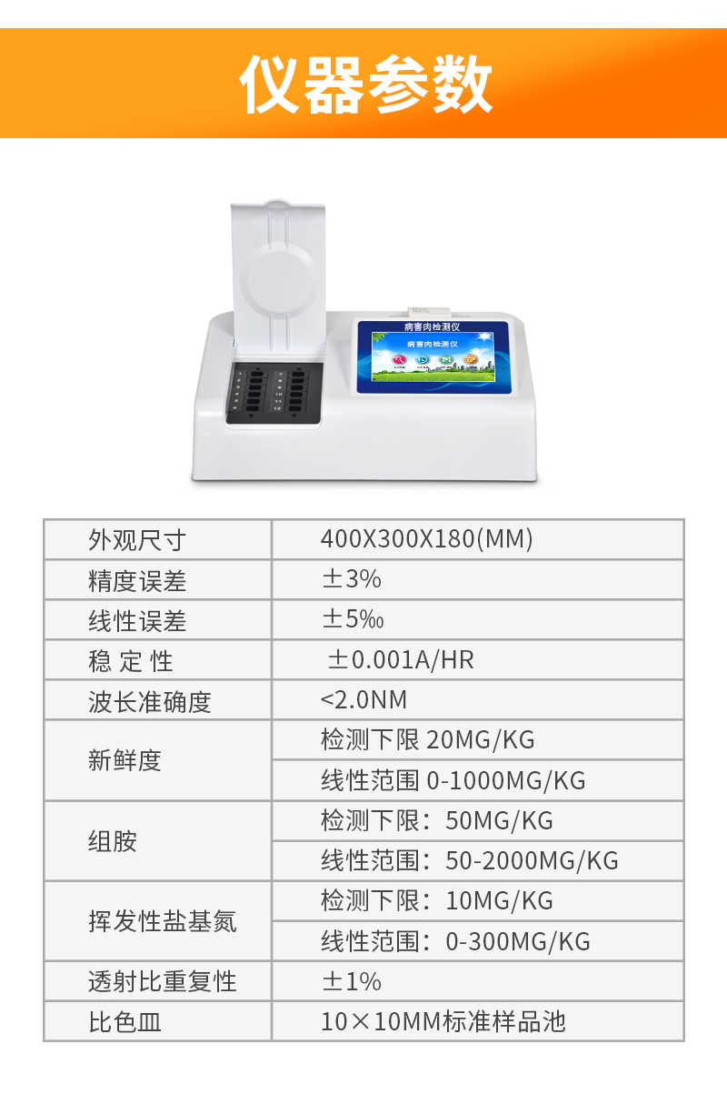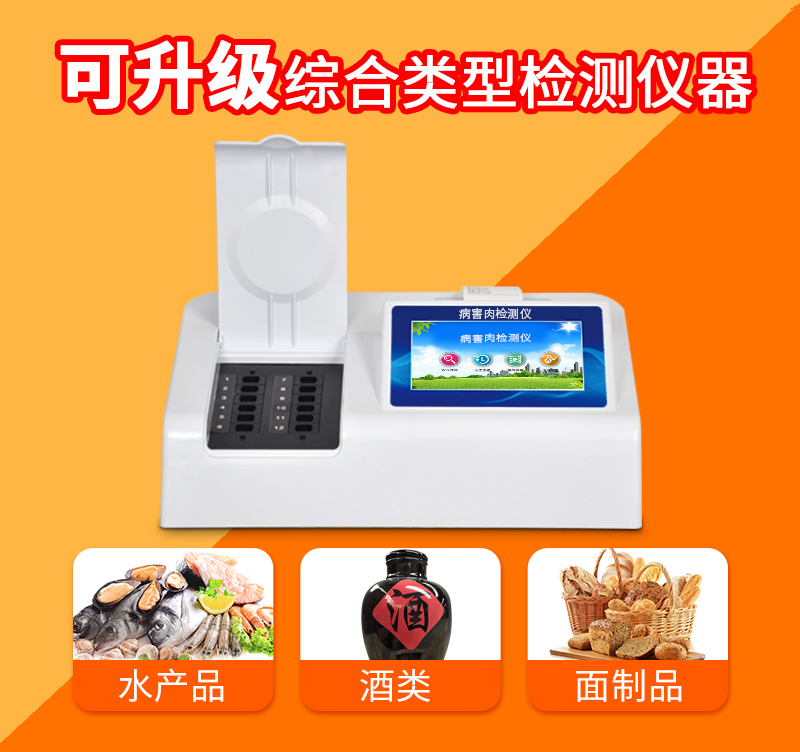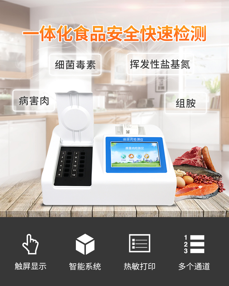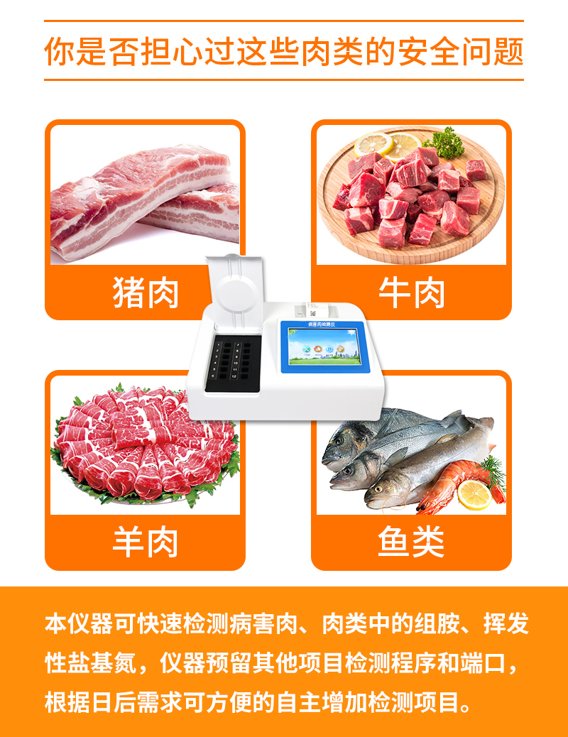 可快速檢測病害肉、組胺、揮發(fā)性鹽基氮,儀器預(yù)留其他項(xiàng)目檢測程序和端口,根據(jù)日后需求可方便的自主增加檢測項(xiàng)目。