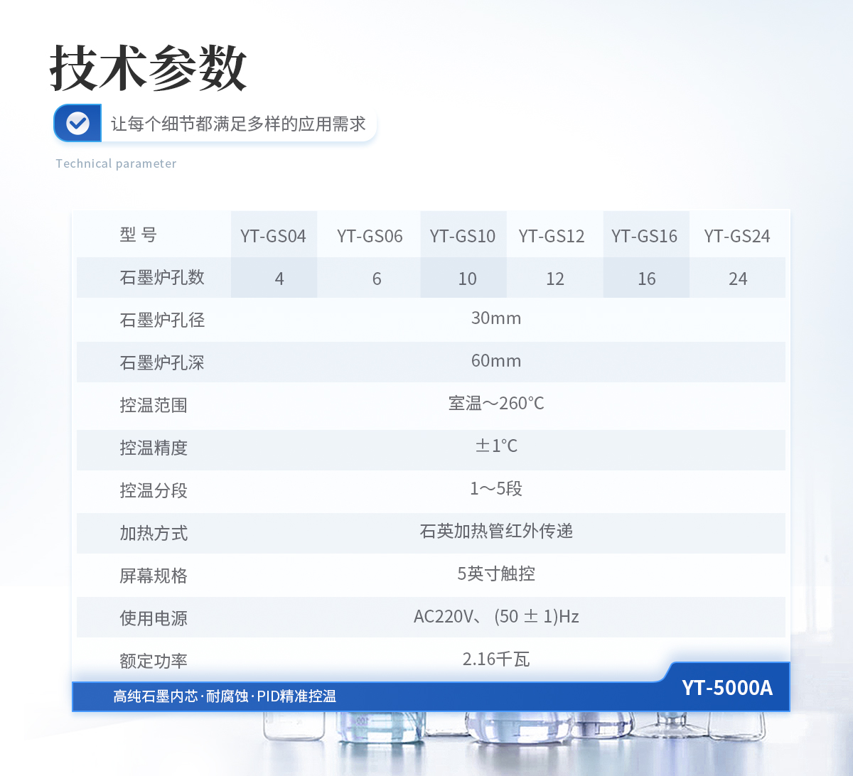 石墨爐孔:孔徑30mm,孔深60mm,孔數(shù)5×2 控溫范圍:室溫~260℃ 控溫精度:±1℃ 控溫分段:1~5段 加熱方式:石英加熱管紅外傳遞 屏幕規(guī)格:5寸觸控 主機(jī)外型尺寸:寬522mm×深371mm×高168mm 使用電源:AC220V、 (50 ± 1)Hz 額定功率:1.6千瓦