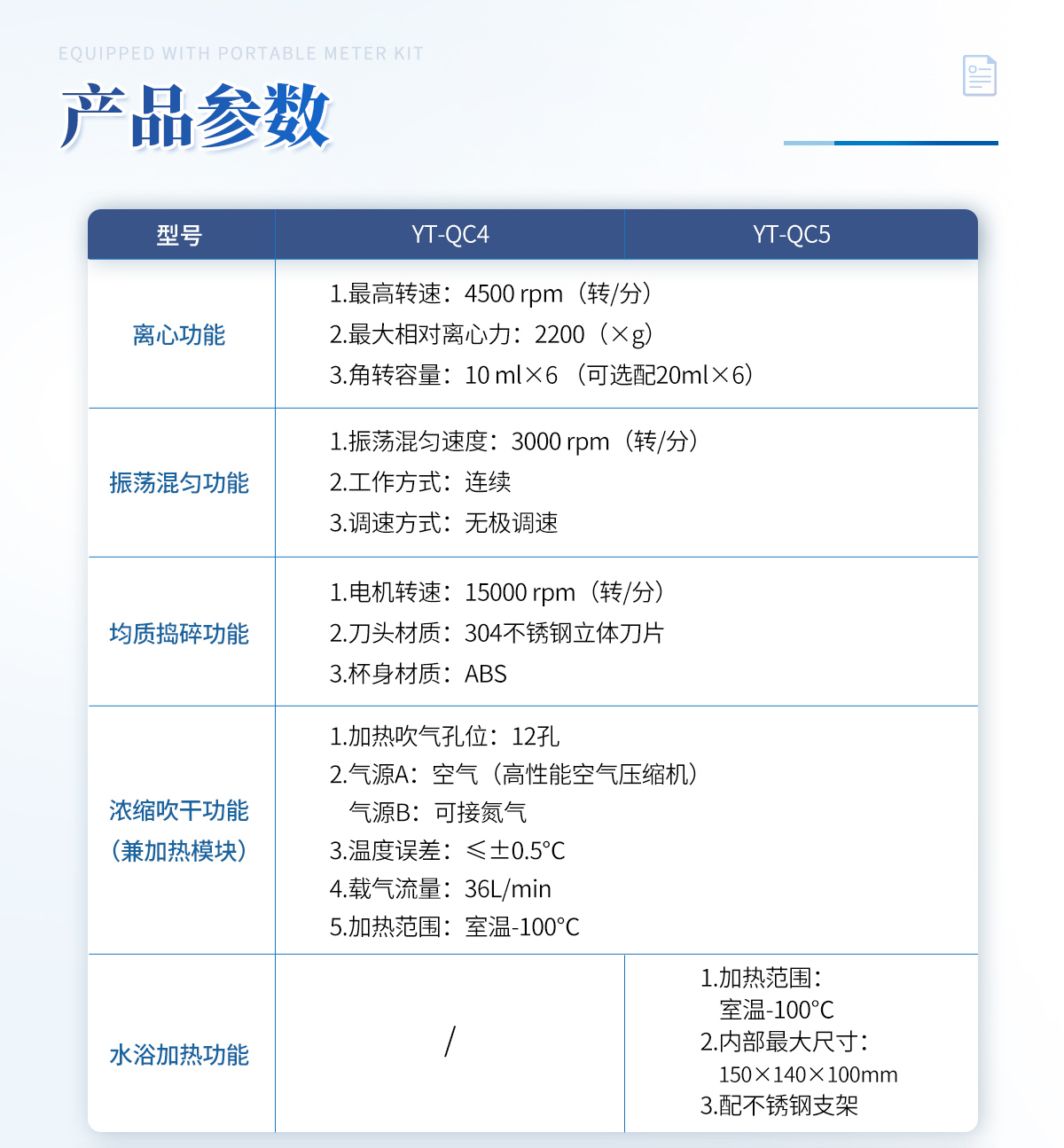 | 離心功能 1.**轉(zhuǎn)速:4500 rpm(轉(zhuǎn)/分) 2.**相對離心力:2200(×g) 3.角轉(zhuǎn)容量:10 mlx6 (可選配20mlx6) | 振蕩混勻功能 1.振蕩混勻速度:3000 rpm(轉(zhuǎn)/分) 2.工作方式:連續(xù) 3.調(diào)速方式:無極調(diào)速 | 均質(zhì)搗碎功能 1.電機轉(zhuǎn)速:15000 rpm(轉(zhuǎn)/分) 2.刀頭材質(zhì):304不銹鋼立體刀片 3.杯身材質(zhì):ABS | 濃縮吹干功能(兼加熱模塊) 1.加熱吹氣孔位: 12孔 2.氣源A: 空氣(高性能空氣壓縮機) 氣源B: 可接氮氣 3.溫度誤差:≤±0.5℃ 4.載氣流量:36L/min 5.加熱范圍:室溫-100℃ | 水浴加熱 1.加熱范圍:室溫-100℃ 2.內(nèi)部**尺寸:150mmX140mmX100mm 3.配不銹鋼支架 |