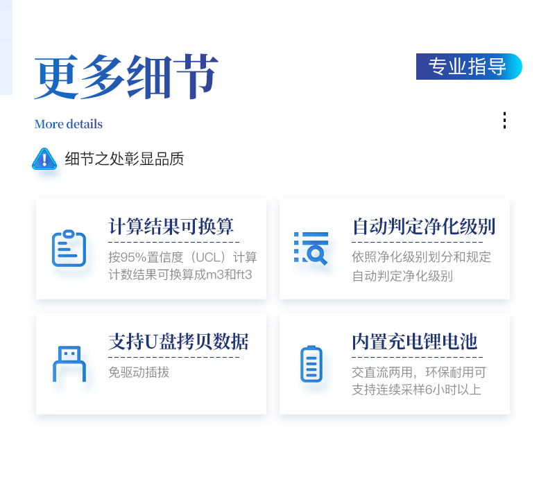 1、安卓系統(tǒng)7.1版本,操作交互體驗(yàn)更好。 2、內(nèi)置溫濕度傳感器、環(huán)境氣壓傳感器 3、核心部件光散射傳感器明顯消除腔體的雜散光,信噪比大為提高。從而使測(cè)量更準(zhǔn)確更可靠。 4、按95%置信度(UCL)計(jì)算,計(jì)數(shù)結(jié)果可換算成m3和ft3 5、依照凈化級(jí)別劃分和規(guī)定,自動(dòng)判定凈化級(jí)別,使用便利。 6、帶審計(jì)追蹤功能,可查詢、可追溯、可控制,符合FDA 21CFR PART11規(guī)范 7、支持wifi、藍(lán)牙傳輸,數(shù)據(jù)可無(wú)線上傳;同時(shí)支持U盤拷貝數(shù)據(jù),免驅(qū)動(dòng)插拔。 8、配置監(jiān)管平臺(tái),檢測(cè)結(jié)果可直接無(wú)線傳至平臺(tái),進(jìn)行潔凈度長(zhǎng)短期分析,輔助管理。 9、內(nèi)置新一代高速熱敏打印機(jī),可選擇所需要打印的粒徑通道,靈活打印結(jié)果。 10、交直流兩用,內(nèi)置充電鋰電池,環(huán)保耐用可支持連續(xù)采樣6小時(shí)以上。 11、便捷簡(jiǎn)易伸縮式云臺(tái)支架,安裝采樣操作更加方便。