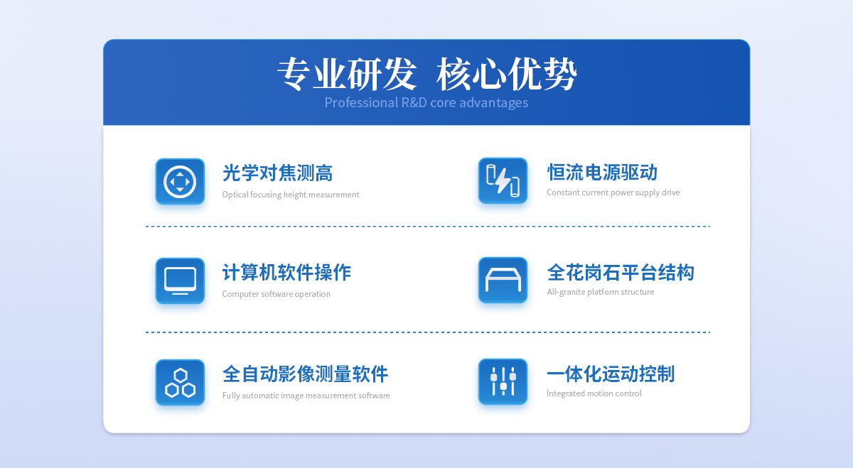 | 儀器基座 高穩(wěn)定性高精度花崗石材質(zhì) 1套 | CCD 700TVL COMST模擬信號相機 1個 | 鏡頭 0.7~4.5 X手動卡位鏡頭(萊斯) 1個 | 光柵尺 高精度位移傳感電子尺,分辨率:1μm (精微) 2條 | 導(dǎo)軌 咸陽藍博P級精密V型導(dǎo)軌(LB) 3組 | 傳動 西德無牙光桿精密傳動(西德)、高精密T型絲桿(特制) 3條 | 表面光源 LED恒流環(huán)形冷光源 1個 | 底光源 綠色單顆LED冷光源+雙組透鏡均光平行底光模組 1PCS | 數(shù)據(jù)采集卡 UWC3200 1PCS | 影像測量軟件 DTV 2.5T手動影像測量軟件 1套 | 光學(xué)校正片 DTV 定制 1塊 | 電纜 AC/DC 5條 |