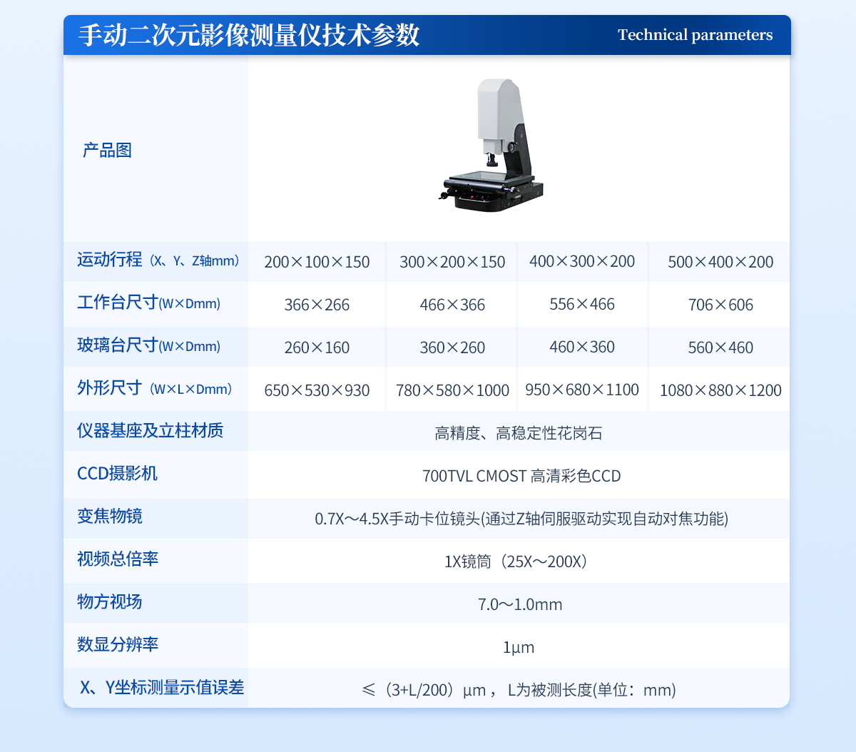 | l 運動行程(X、Y、Z軸mm):500×400×200 | l 工作臺呎寸(W×Dmm): 706×606 | l 玻璃臺呎寸(W×Dmm): 560×460 | l 外形尺寸(W×L×Dmm): 1080×880×1200 | l 工作距離:90mm | l 儀器基座材質(zhì):高精度、高穩(wěn)定性花崗石 | l CCD攝影機:700TVL COMST模擬信號相機 | l 變焦物鏡: 0.7X~4.5X手動卡位鏡頭 | l 視頻總倍率:1X鏡筒(25X~200X) | l 物方視場: 7.0~1.0mm | l 數(shù)顯分辨率:1μm | l X、Y坐標測量示值誤差≤(3+L/200)μm , L為被測長度(單位:mm) |