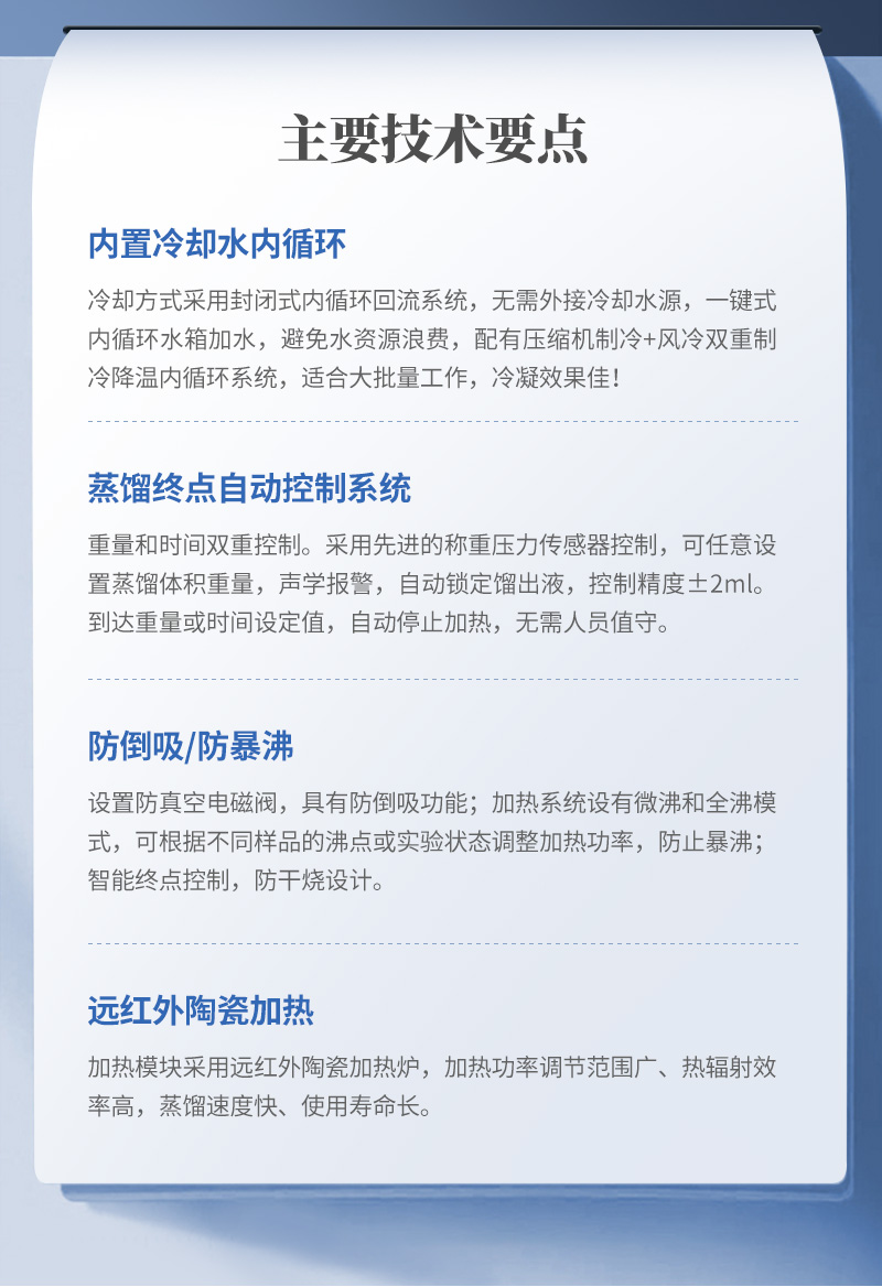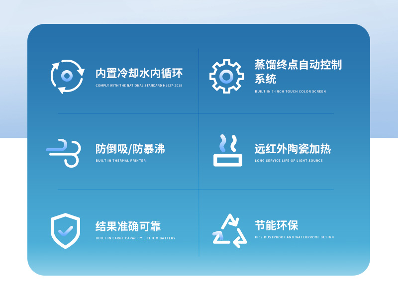 智能一體化蒸餾儀是根據(jù)實(shí)驗(yàn)室蒸餾預(yù)處理操作規(guī)程,集恒溫加熱、蒸餾終點(diǎn)自動(dòng)控制、冷卻水循環(huán)于一體的新型智能蒸餾處理裝置。